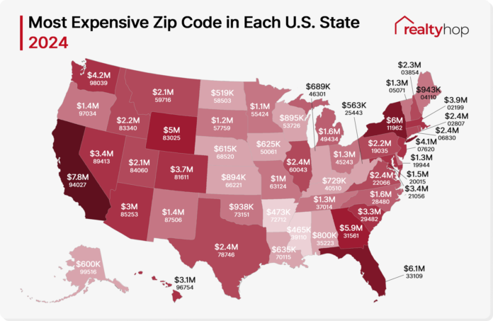 This RealtyHop Most Expensive Zip Codes Report analyzed the most expensive zip codes in the United States using over three million for-sale listings drawn from the RealtyHop database during the period between January 1, 2024, and October 15, 2024. To produce the ranking, the median price for each zip code was calculated and sorted from most expensive to least expensive.