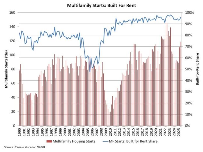 According to NAHB analysis of quarterly Census data, the count of multifamily, for-rent housing starts increased during the third quarter of 2025. For the quarter, 119,000 multifamily residences started construction. Of this total, 114,000 were built-for-rent. This built-for-rent total was 31% higher than the third quarter of 2024. This marks a significant increase, and it is possible these numbers will be revised lower in future Census data given other multifamily data reporting.