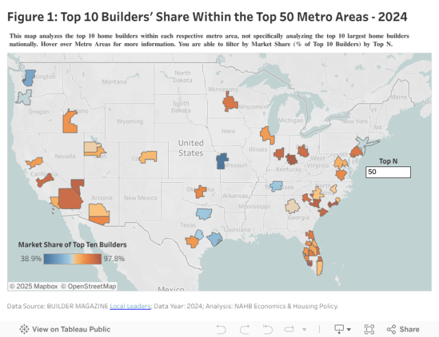 The 2024 data show that the top 10 builder concentration in the 50 largest markets ranged from 38.9% in Kansas City, MO-KS to 97.8% in Cincinnati, OH. In 11 metro areas, the top ten builders’ market share exceeded 90%. Across all 50 metro areas, the average market share of the top 10 builders was 79.3%, up from 78.2% in 2023.