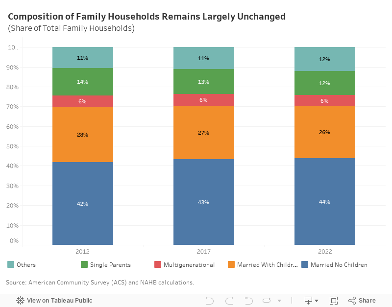 In further analysis of the Census’s American Community Survey (ACS) data, NAHB dives deeper into the homeownership rate for other family household types: married couples with no children, married couples with children and single parent households. In 2022, most family households were married with no children (44%), followed by married with children (26%), single parents (12%), others (12%), and multigenerational families (6%). This composition has not changed much, with the exception of a gradual decrease in the share of married with children and single parent households, which is offset by an increase in the share of married with no children households.