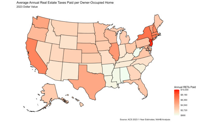 Nationally, across the 86 million owner-occupied homes in the U.S., the average annual real estate taxes paid in 2023 was $4,112, according to NAHB analysis of the 2023 American Community Survey. Homeowners in New Jersey continued to pay the highest real estate taxes, paying an average of $9,572, 30.6% higher than the second highest, New York, at $7,329 . On the other end of the distribution, homeowners in Alabama paid the lowest average amount of real estate taxes at $978. The map below shows the geographic variation of average annual real estate taxes (RETs) paid.