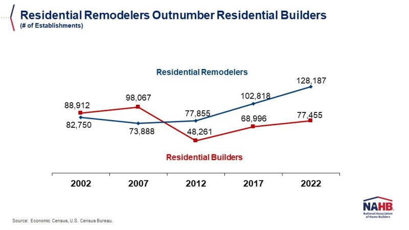 The number of residential remodelers in the U.S. has reached a record high of 128,187 establishments, 65% higher than the number of residential builders (single-family and multifamily), which stands at 77,455. These official government counts were released by the U.S. Census Bureau as part of its 2022 Economic Census, which tallies American businesses every five years (in years ending in 2 and 7).