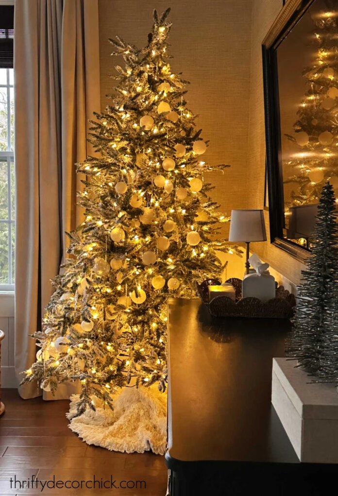 This year I did all silver and white ornaments on that tree, but didn’t hang them everywhere. I kind of cascaded them around the tree, in a band of ornaments.
