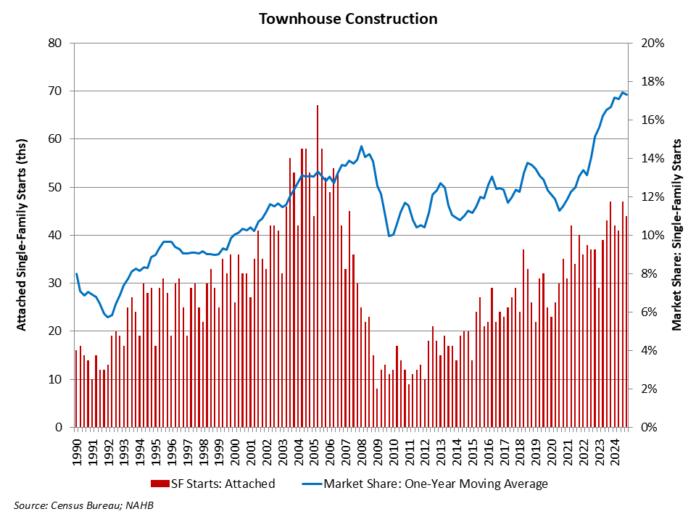 Townhouse construction expanded 10% during 2024, outpacing the rest of the single-family home building market.
