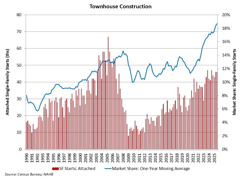 Townhouse construction gained single-family construction market share during the third quarter of 2025.