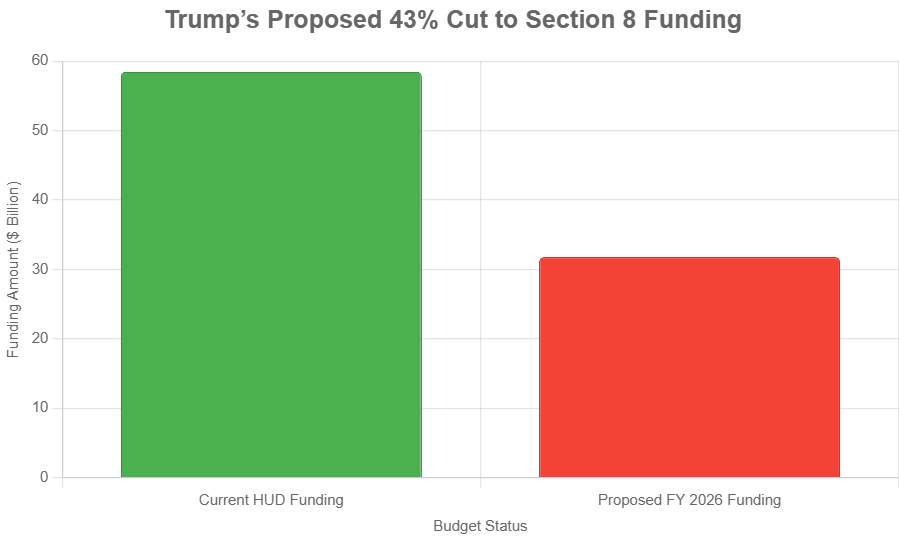 • 43% Cut to HUD’s Rental Assistance: The budget proposes slashing funding from $58.5 billion to $31.8 billion. This affects not just Section 8, but also public housing, project-based assistance, and programs for retirees and individuals with disabilities. That’s almost $27 billion in rental assistance alone going away.
