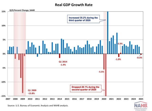 According to the “advance” estimate released by the Bureau of Economic Analysis (BEA), real gross domestic product (GDP) decreased at an annual rate of 0.3% in the first quarter of 2025, following a 2.4% gain in the fourth quarter of 2024. This marks the first quarter of economic contraction since the first quarter of 2022. NAHB predicted a 0.2% increase for the first quarter of 2025.