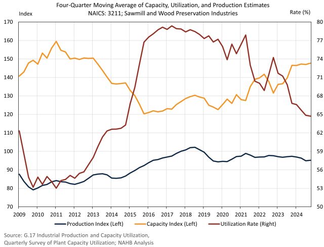 Sawmill and wood preservation firms reported lower capacity utilization rates coupled with level production and capacity throughout 2024. Despite no growth in production in 2024, utilization rates have trended downwards since 2017 as sawmills have expanded production capability. Even with more production capability, real output has not followed as output remains lower than 2018.
