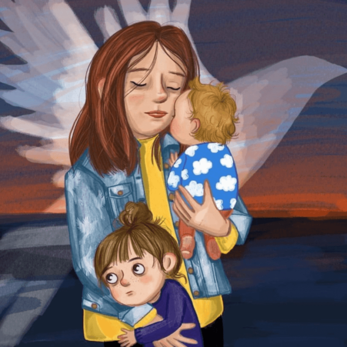 Miriam Kraft lovingly draws an image of a modern young mother who looks like she just took a deep inhale. Perhaps, she is praying for peace. Dark circles under eyes. Hair unbrushed. Swollen faces. She is at a crossroads. Did she just lose her home? Is she fleeing to save her children? The intensity of the moment is multiplied by the softness of the baby’s little bright blue shirt with innocent white clouds. Obviously, the woman is thunderstruck but she stands strong. The immense image of the Peace Dove is transparent, powerful, and clear over the flames and darkness of the war.