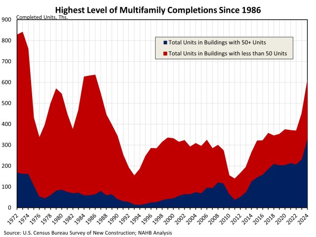 Multifamily units completed in 2024 recorded their highest level since 1986 at 608,000 units, according to NAHB analysis of the Census Bureau’s Survey of Construction. For the eighth consecutive year, most multifamily units were in buildings with 50 or more units (these will be labeled as high-density buildings).