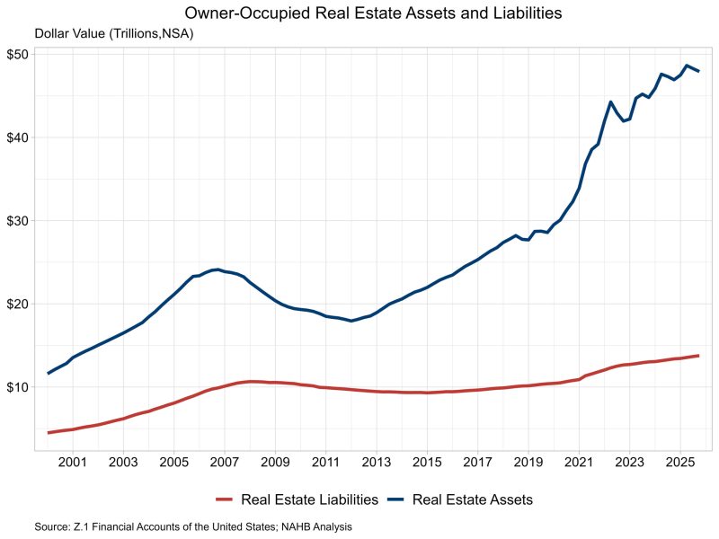 The market value of household real estate assets fell for the second consecutive quarter to $47.9 trillion in the fourth quarter of 2025, according to the most recent release of U.S. Federal Reserve Z.1 Financial Accounts. The fourth quarter level is 0.7% lower than the third quarter but is 2.1% higher than a year ago.