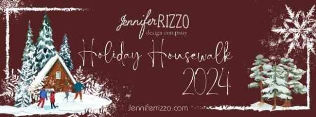 A holiday-themed banner with "Jennifer Rizzo Holiday Housewalk 2024" in decorative text. Features a snowy cabin, people, pine trees, and snowflakes. Website included at the bottom.