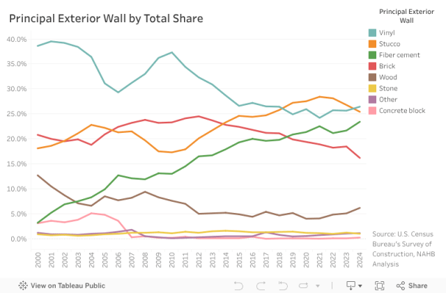 In 2024, vinyl siding was the most used principal exterior wall material for homes started. It holds just over a quarter share of homes, slightly surpassing stucco for the first time since 2018.