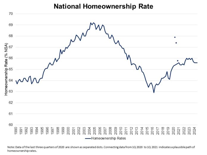 The U.S. homeownership rate held steady at 65.6% in the third quarter of 2024, showing a flat trend over the last three quarters. However, this marks the lowest rate in the last two years. The homeownership rate remains below the 25-year average rate of 66.4%.