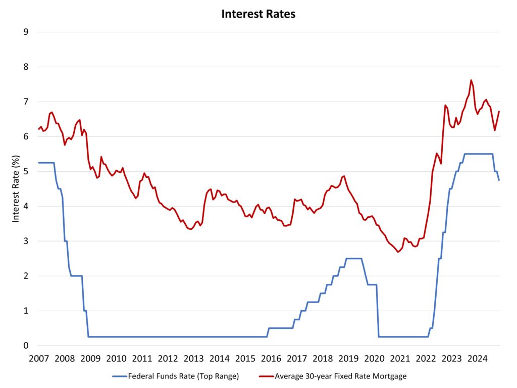 The Fed cut the short-term federal funds rate by an additional 25 basis points at the conclusion of its November meeting, reducing the top target rate to 4.75%. However, while the Fed noted it is making progress to its 2% inflation target, it did not provide post-election guidance on the pace and ultimate path for future interest rate cuts. The bond market is not waiting, with the 10-year Treasury rate rising from 3.6% in mid-September to close to 4.3% due to changing growth and government deficit expectations.