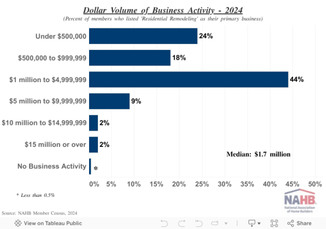 Over 80% of remodelers earned less than $5 million in 2024: 24% reported a dollar volume of less than $500,000, 18% reported between $500,000 and $999,999, 44% (plurality) between $1.0 and $4.9 million, 9% between $5.0 and $9.9 million, 2% between $10.0 million and $14.9 million, and another 2% reported $15.0 million or more. The median annual revenue for residential remodelers in 2024 was $1.7 million. For comparison, the Small Business Administration’s size standards classify residential remodelers as small if they have average annual receipts of $45.0 million or less.