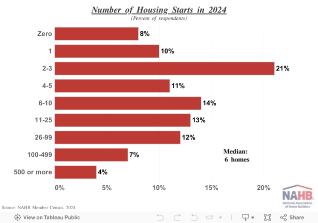 The typical builder runs a small business. The median number of homes started by NAHB builders in 2024 was six.  This figure has remained unchanged since 2021.  Ten percent started one unit, 21% (the plurality) started two or three units, 11% started four or four units, 14% started six to ten, 13% started 11 to 25, 12% started 26 to 99, 7% started 100 to 499, and 4% started 500 homes or more.  Eight percent indicated that they did not start any homes in 2024.