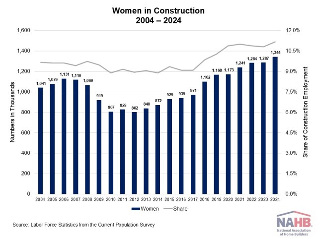 In 2024, the number of women employed in the construction industry rose to around 1.34 million. Women now represent 11.2% of the construction workforce, the highest share in the past 20 years. This rise aligns with the growing presence of white-collar jobs in the industry. As the industry continues to face a persistent shortage of skilled labor, expanding the workforce remains one of the top priorities of the industry. Increasing the participation of women into the construction labor force represents a potential opportunity for future growth. This article examines the role of women in construction using labor force statistics from the Current Population Survey (CPS).