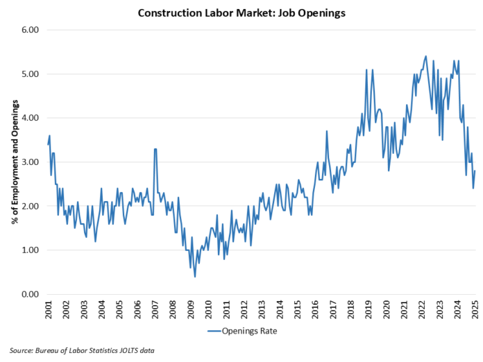 The construction job openings rate edged higher to 2.8% in January, significantly down year-over-year from 4.8%.