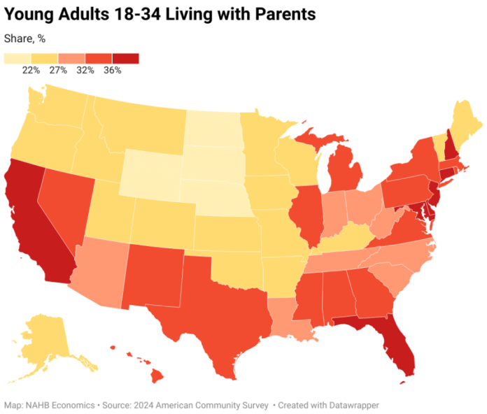 While the national average share increased to 31.8%, over 40% of young adults ages 18-34 lived in parental homes in New Jersey (44%) and Connecticut (41%). California and Maryland register the nation’s third and fourth-highest shares of 39% and 38%, respectively. At the opposite end of the spectrum are states with less than a fifth of young adults living with parents. The fast-growing North Dakota records the nation’s lowest share of 12%, while the neighboring South Dakota registers 18%. In the District of Columbia, where the job market was relatively stable in 2024, less than 13% of young adults lived with their parents. The cluster of north-central U.S. states completes the nation’s list with the lowest percentages of young adults remaining in parental homes.